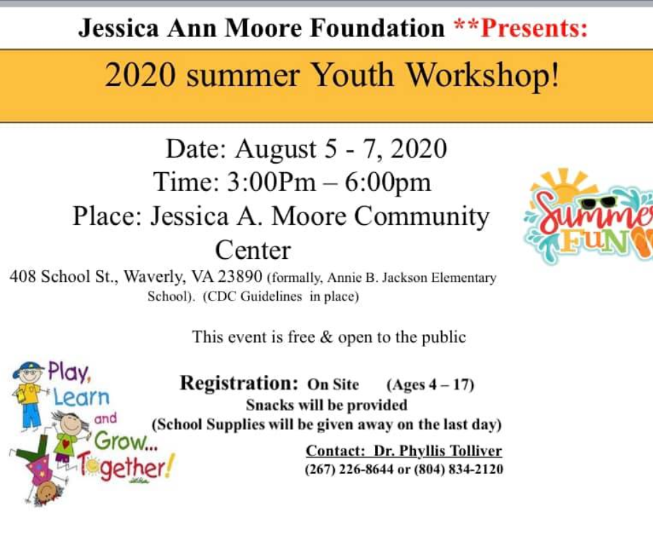 The Jessica Ann Moore Foundation will conduct a “Two Day Summer Youth Workshop” on August 7 – 8, 2018 at